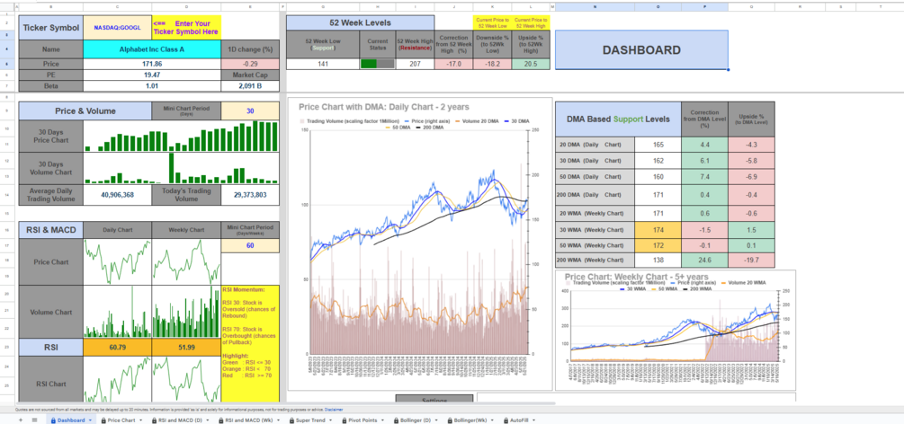Gain Instant stock Insights in google sheets. Popular technical indicators like Bollinger Bands, RSI, MACD, DMA, Super Trends and 52 week levels.