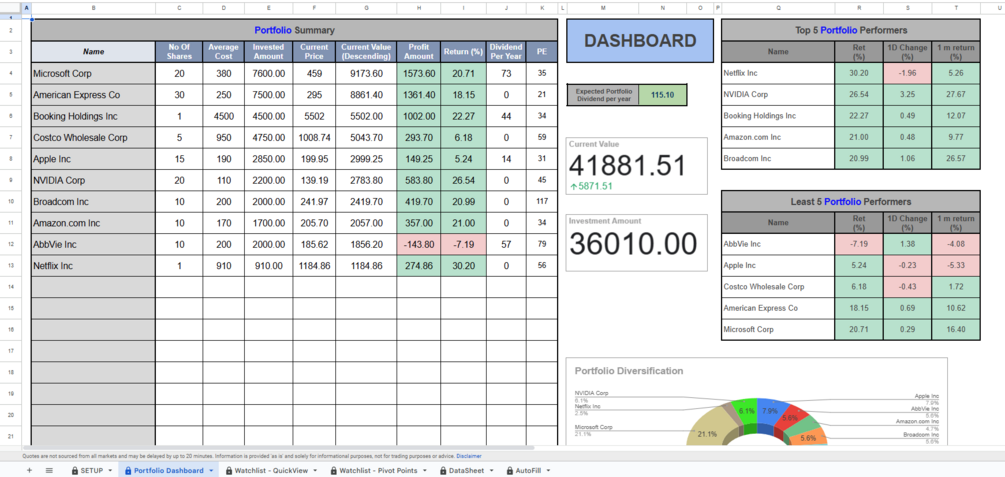 -   Add your own stocks in the Watchlist Setup tab – Number of Shares, Average Cost, Dividend Yield, and Number of Dividends Per Year and unlock the Portfolio Dashboard with a summary table, top/least performers, and diversification charts.